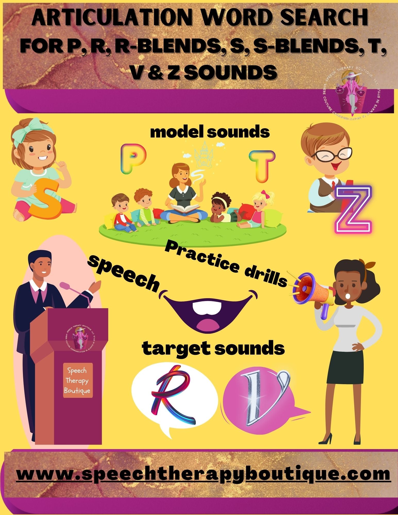 Articulation Word Search For: P, R, R-Blends, S, S-Blends, T, V & Z Sounds