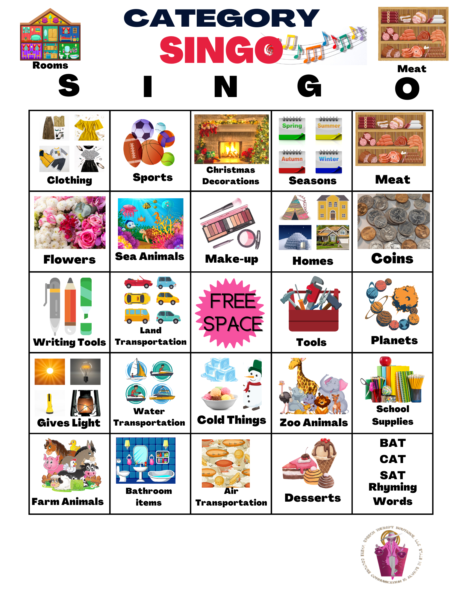 This easy-to-play Category SingO game gives children a fun way to identify pictures/words—and build their vocabulary! It’s played just like traditional bingo, only when you call out a word, kids try to find it on their photo-illustrated game cards! Category SingO game includes all the materials you need for up to 33 players. (35 pages )