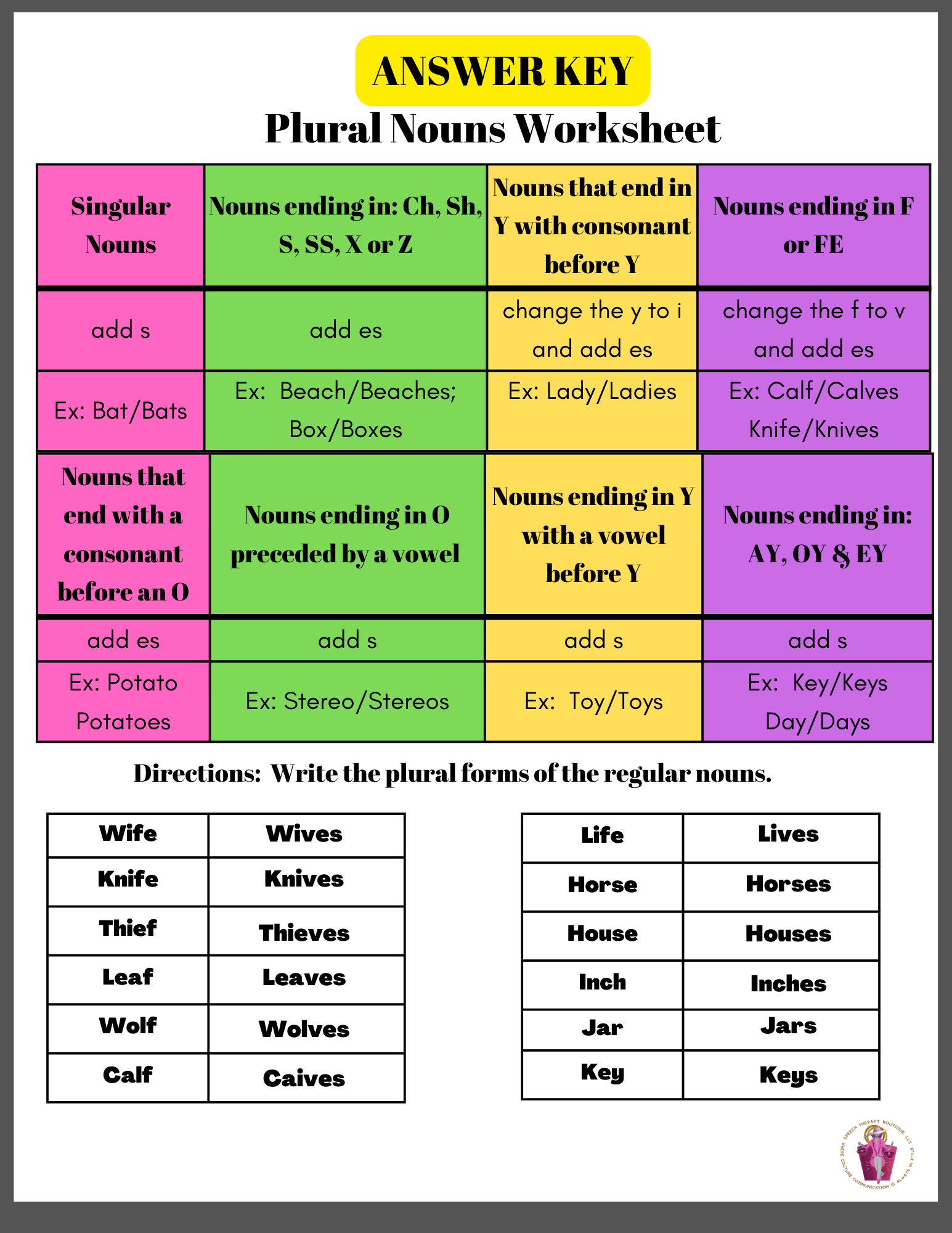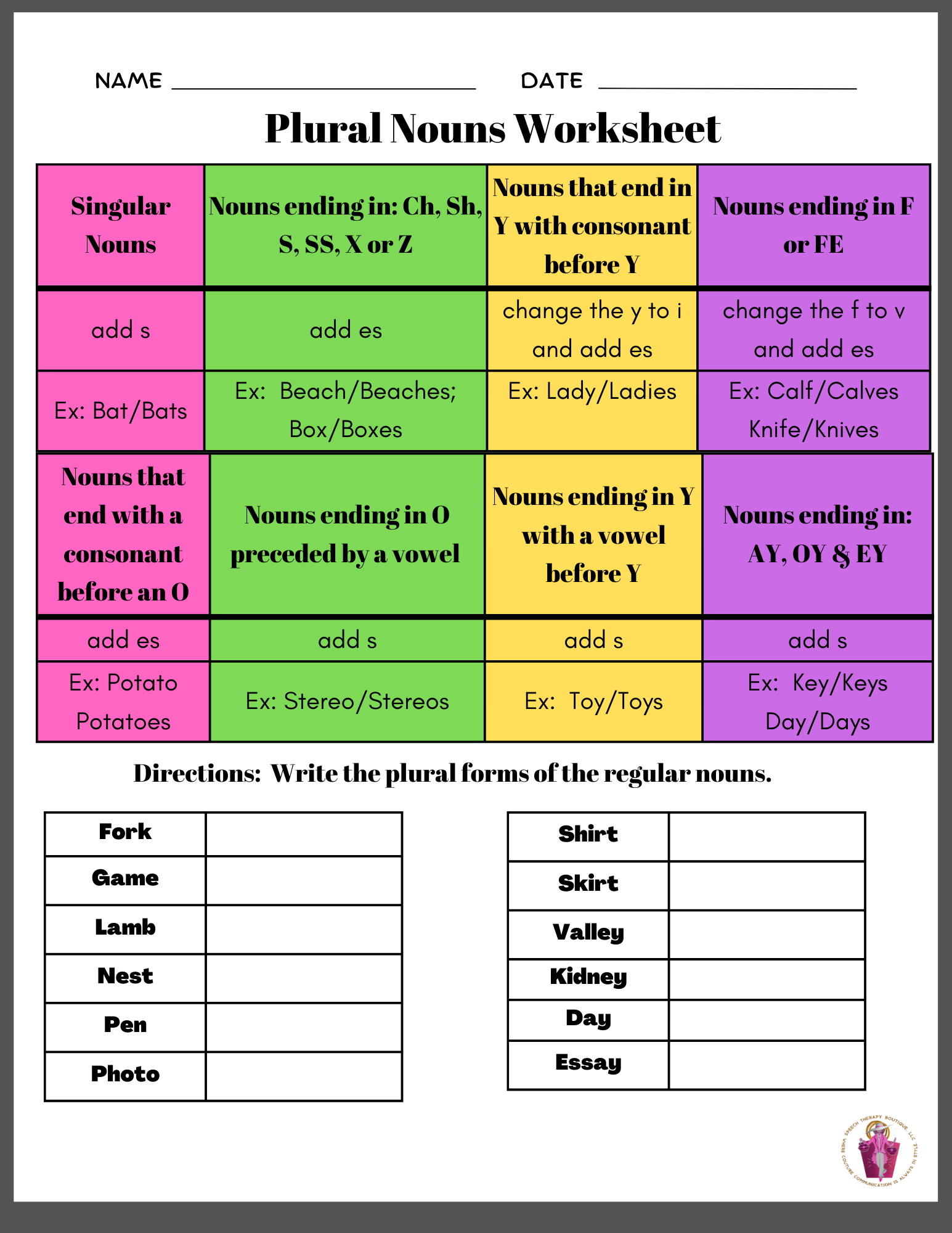 These regular and irregular nouns worksheets contain a colorful chart that teaches students how to correctly write all forms of plural nouns. This packet focuses on regular plural noun forms with AY, CH, EY, F, FE, IS, SH, S, SS, X, Y, and Z, endings. With a variety of worksheets, students are able to learn how various forms of plural nouns are written.