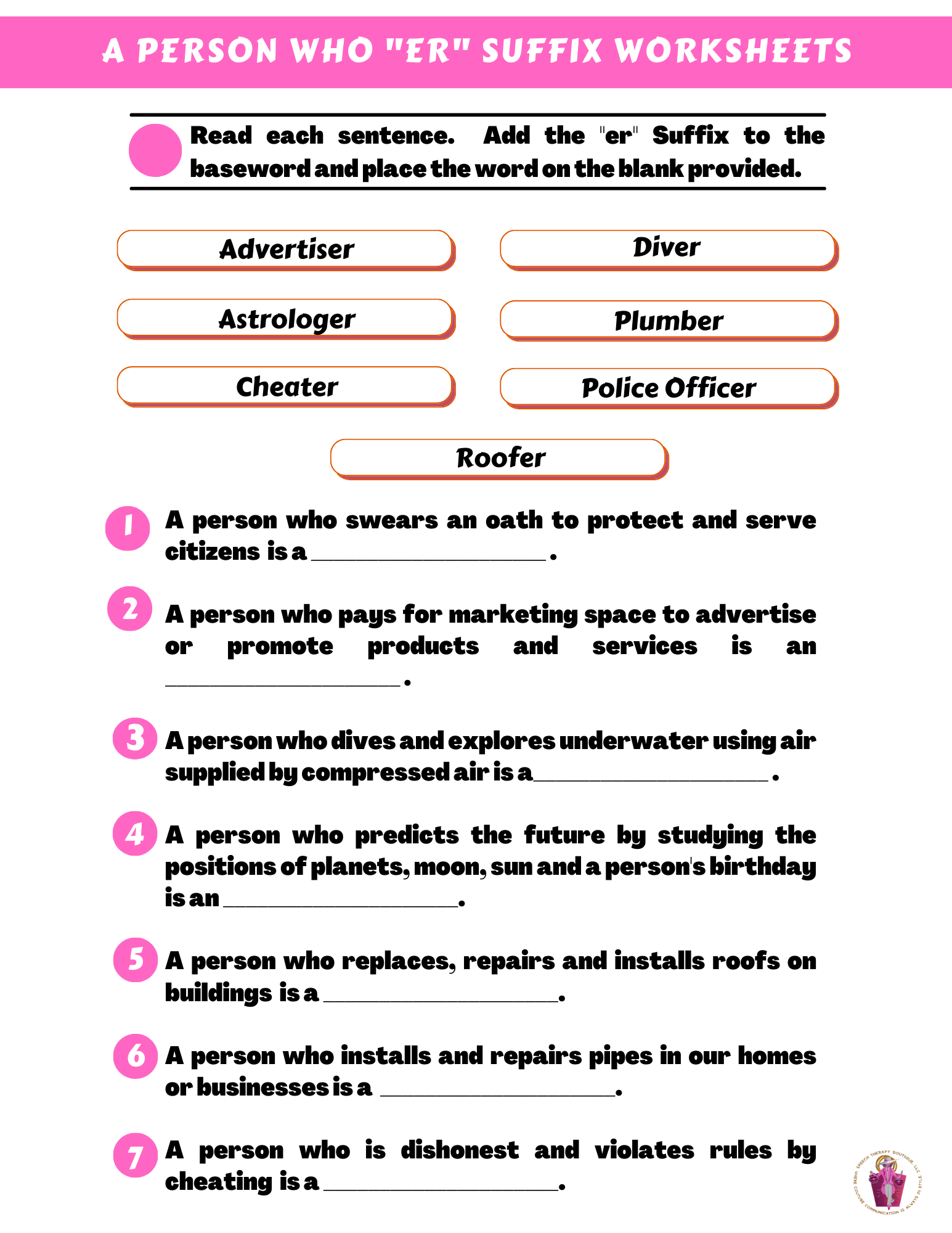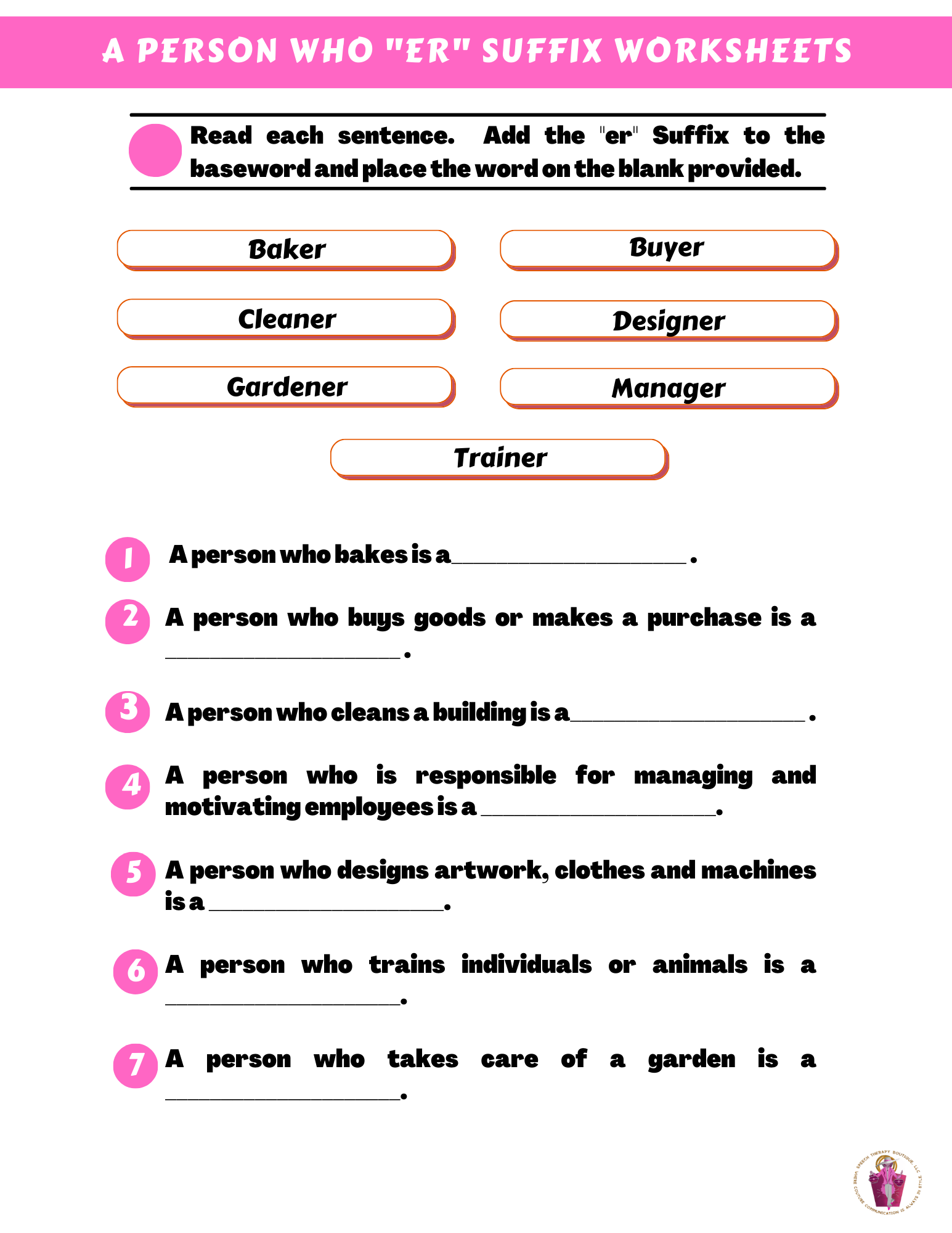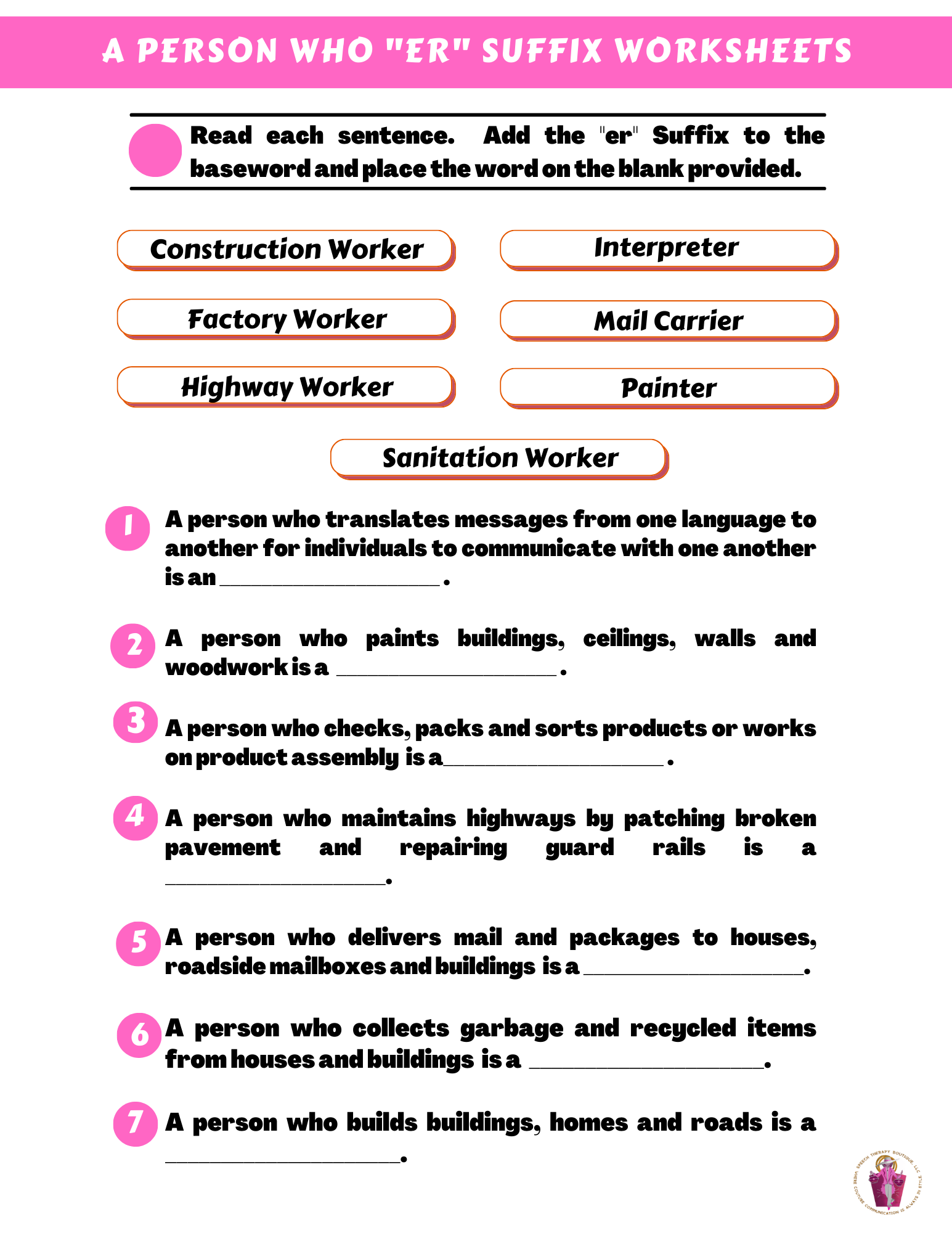 Who Are You? Suffix: “er” (A Person Who) are digital fill-in-the-blank worksheets that are designed to teach and reinforce the most commonly used suffix: “er” as a person or object that does a specified action. The activities focus on adding “er” to the end of verbs to show an individual’s job or occupation (ex: Singer). (17 pages)